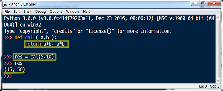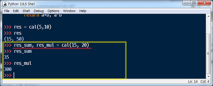 # 즉 결과값으로 변수 res는 ( 15, 20 )라는 튜플 값을 갖는다.
