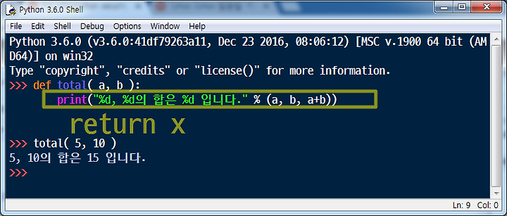 ↑ 5, 10의 합은 15 입니다 라는 결과값을 돌려주는것이 아니라, print()함수를 실행한 것이다.