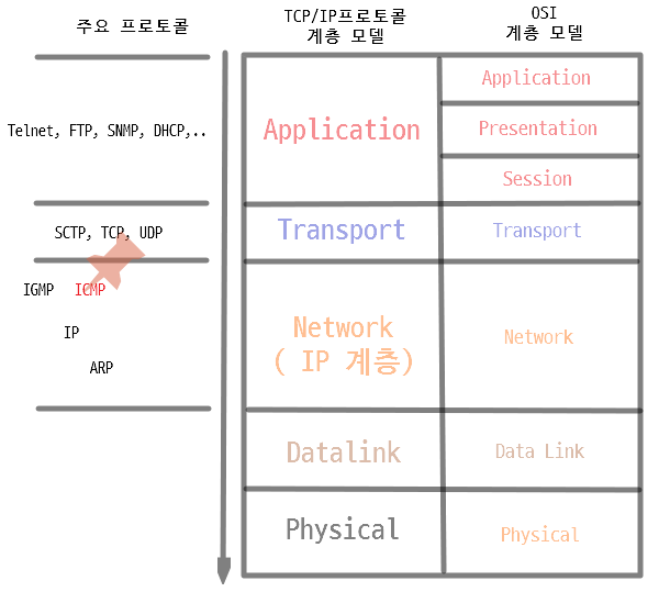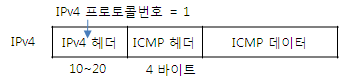 ↑ ICMP는 IP의 상위계층처럼 보이지만, 결국, ICMP는 IP계층의 일부이며, IP데이터그램의 데이터 부분에 포함되어 전달된다.