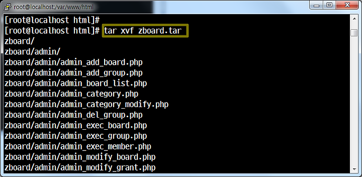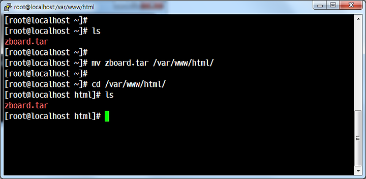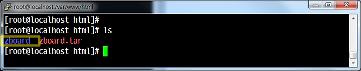 ↑ zboard.tar 파일을 document root 디렉터리로 이동