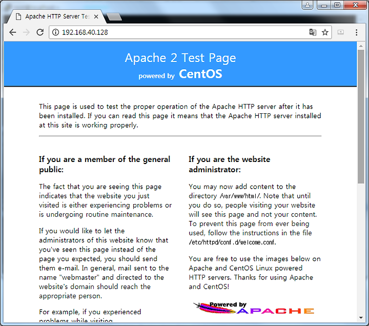 ↑ 웹 서버가 정상적으로 구축되었다면 리눅스 IP를 쳤을때 Apache test page가 나온다.