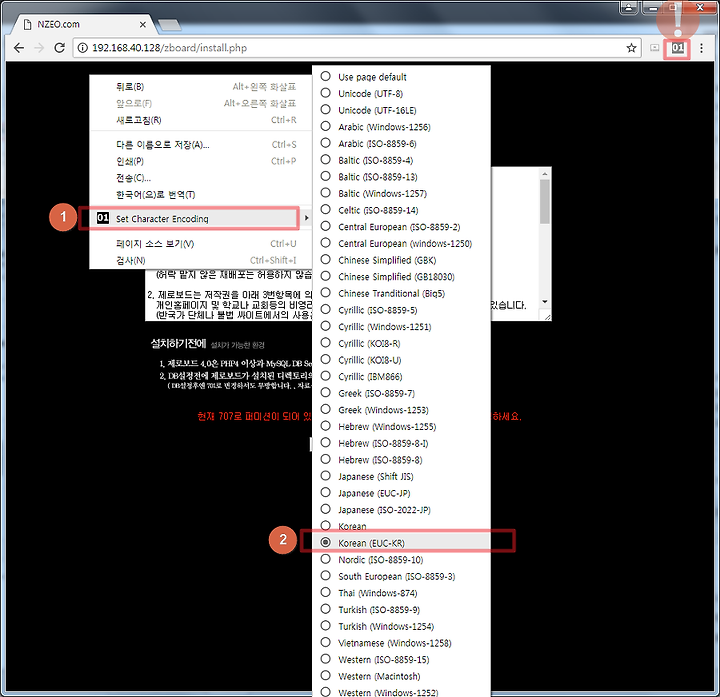 ↑ 해당 웹 페이지에서 우클릭 → Set Character Encoding → Korean ( EUC-KR ) 설정