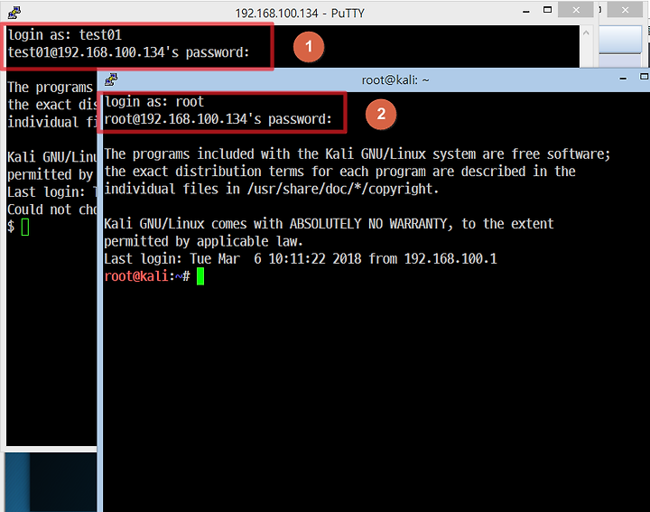 ↑ Putty를 이용해 원격 셸을 한개 더 생성 ( root 사용자로 접근 )