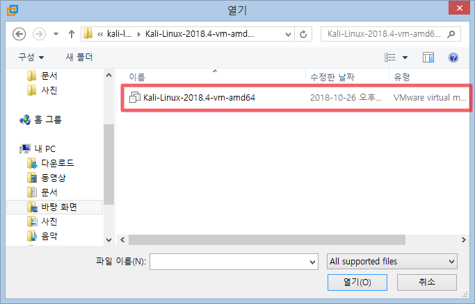↑다운로드 받은 kali linux 이미지 파일을 선택