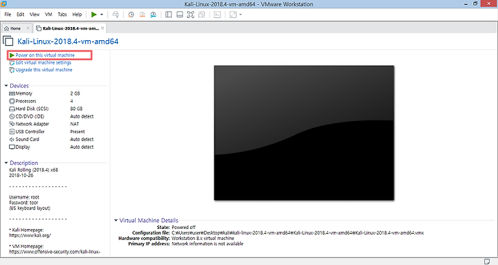 칼리 리눅스 이미지를 importing해서 칼리 리눅스를 실행하는것이다.