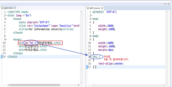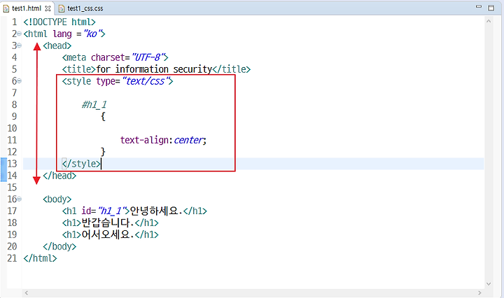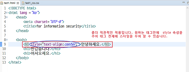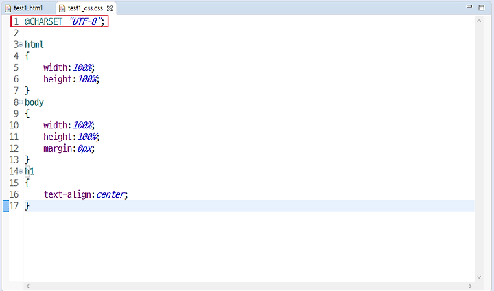 test1.html 파일의 모든 <h1>에 text-align 속성을 적용 해보겠습니다.