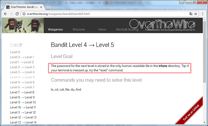 ↑ 다음레벨의 패스워드는 inhere 디렉터리안 파일 어딘가에 있다고 합니다. tip: 터미널이 지저분해지면 "reset 명령어를 이용하면 된다고합니다."
