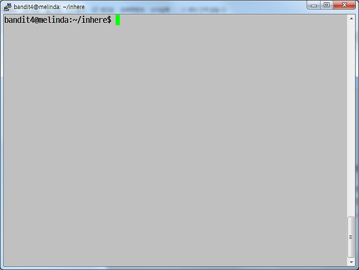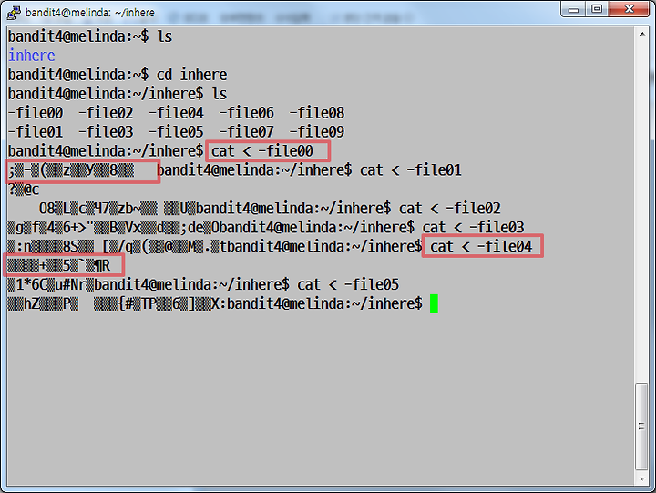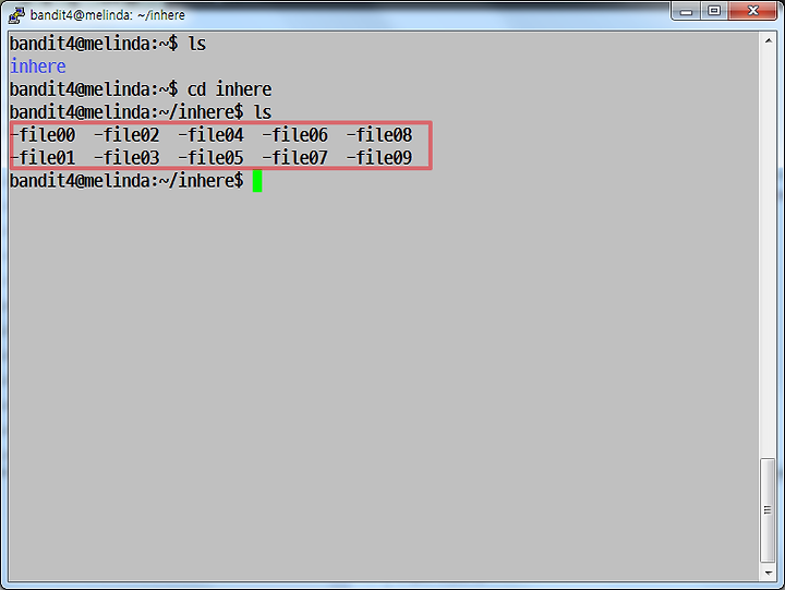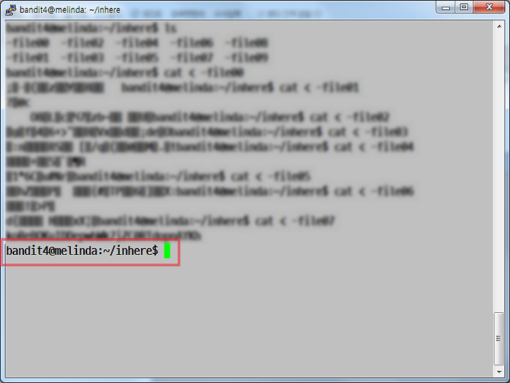 ↑ bandit4에 접속한뒤에 ls 명령어를 통해 보면 " inhere " 이라는 디렉터리가 있습니다. 이 디렉토리 안에 들어가서 다시한번 ls 명령어를 쓰시면