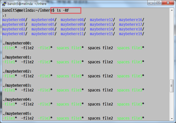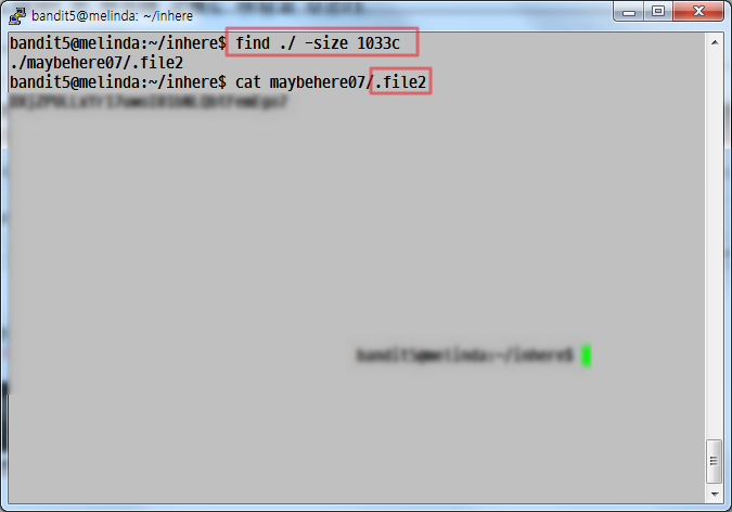 ↑ bandit5는 bandit4와 마찬가지로, inhere디렉토리 어딘가에 키를 담고 있는 파일이 있습니다. 이 파일을 찾을 때 쓸 수 있는