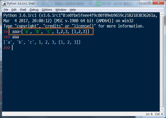 ↑ 리스트를 만들때 타입은 상관없다. 리스트안에 숫자, 문자, 리스트 전부 넣을 수 있다.