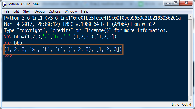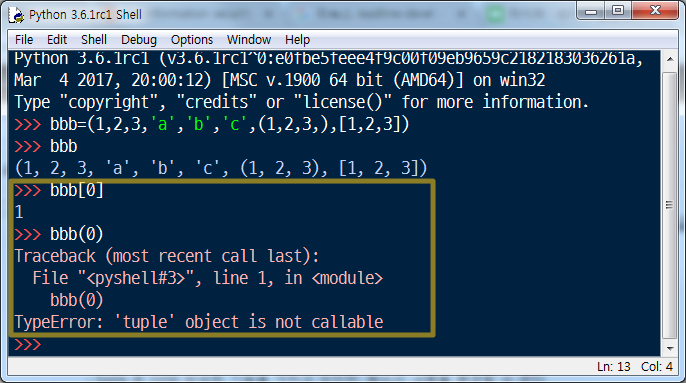 ↑ 튜플 사용시 원소를 지정할때는 소괄호가 아닌 대괄호로 지정해야한다.