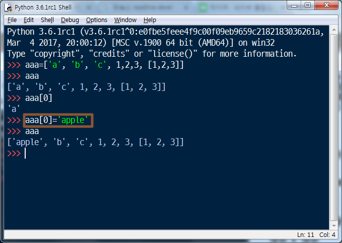 ↑ 리스트를 재 지정해서 원소의 내용을 바꿀 수 있다.