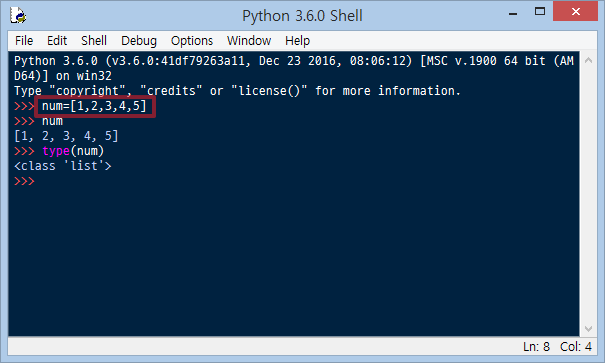 ↑ [1,2,3,4,5] : 5개의 원소로 이루어진 하나의 list이다. list라는 자료형에 원소(item)를 담고 있고, 그 list의 이름은 num이다.
