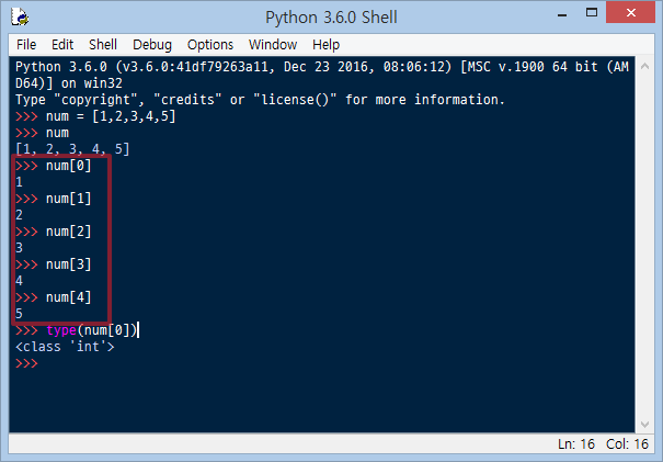 num은 정수 타입의 5개의 원소로 이뤄진 리스트 변수이다.