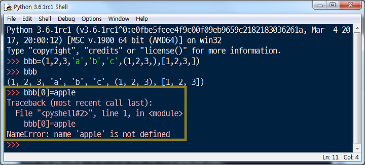 ↑ 튜플은 리스트와달리 원소를 재지정해서 그 값을 변경할 수 없다.
